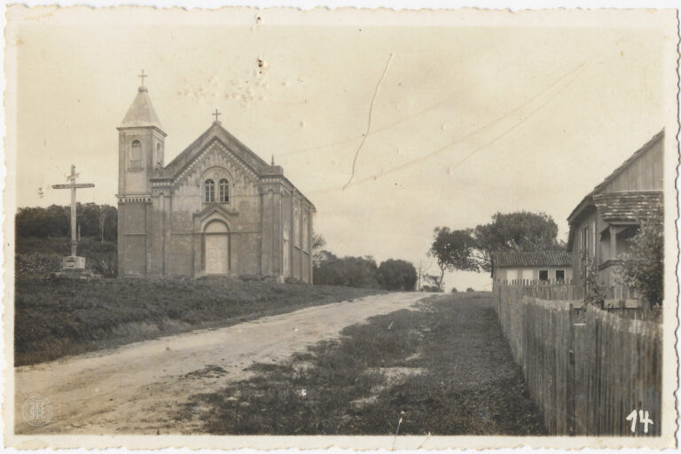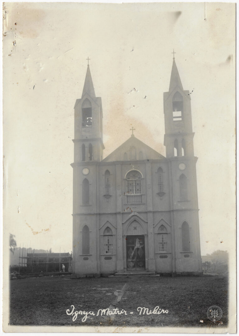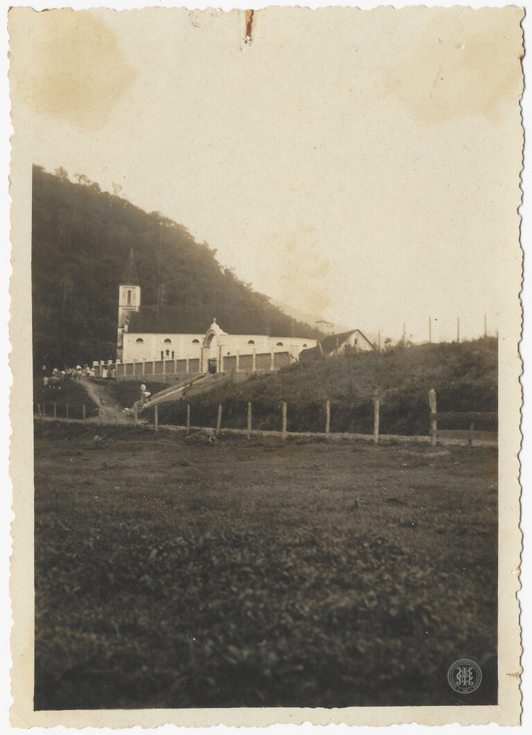 Vista externa de uma igreja em Brusque, Santa Catarina. A edificação religiosa, situada em plano médio, possui arquitetura de influência eclética, com uma torre sineira à esquerda e...