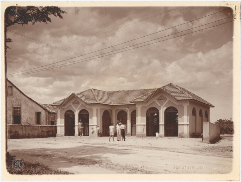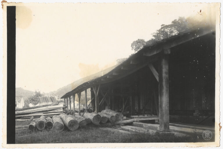 Interior da fábrica de fitas de seda de Otto Schaefer em Brusque, Santa Catarina. A imagem apresenta um grupo de onze operárias, majoritariamente jovens e adolescentes, posicionadas em...