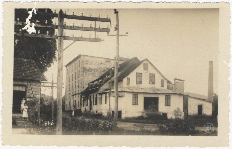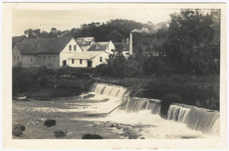 Vista da Fecularia da Companhia Lorenz e da represa do Rio Benedito, integrando a paisagem industrial a elementos naturais em Timbó, Santa Catarina. Em primeiro plano, destaca-se uma...