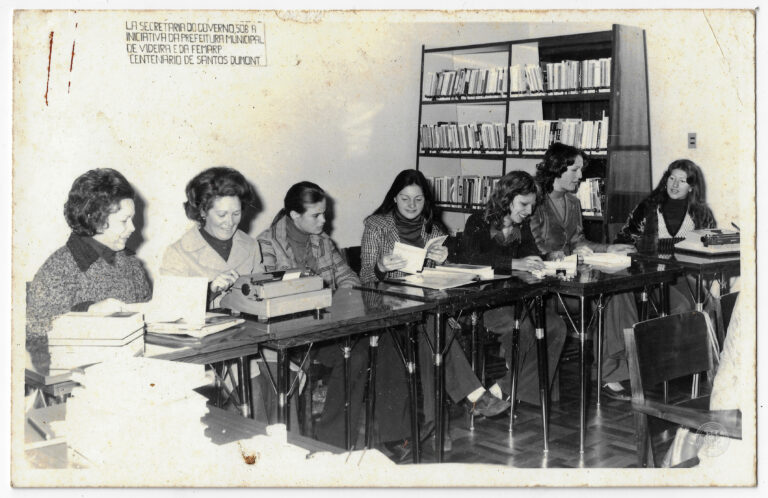 Grupo de sete mulheres sentadas ao longo de mesas retangulares em um ambiente interno, identificado como o município de Videira, Santa Catarina. Em primeiro plano e plano médio,...