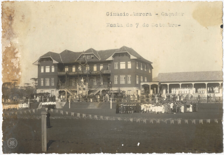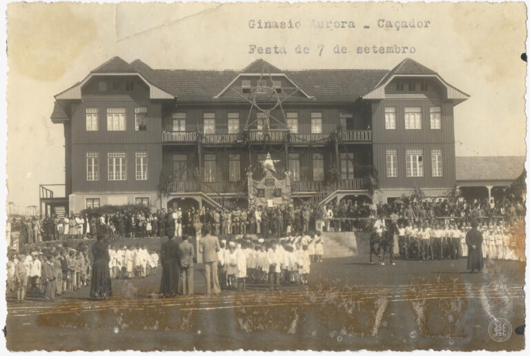 by Eugenio Pelegrin Leia Mais...Celebração da Festa de 7 de setembro em frente ao Ginásio Aurora, em Caçador, Santa Catarina. A composição é centralizada pelo edifício de madeira de dois pavimentos e...