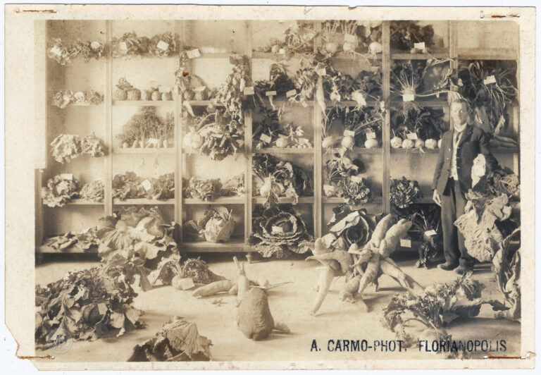Fotografia registrando uma seção da exposição de Santa Catarina, durante a Exposição Nacional de Mapas Municipais, com foco em produtos agrícolas. No primeiro plano, o chão é ocupado...
