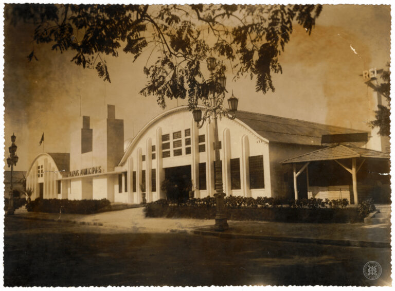 Aspecto externo do Pavilhão da Exposição Nacional de Mapas Municipais no Rio de Janeiro. A composição é centralizada por uma estrutura arquitetônica de grandes proporções com cobertura em...