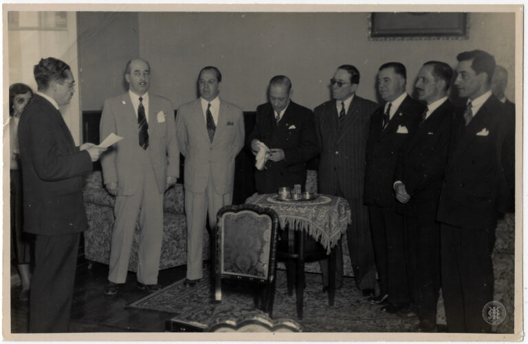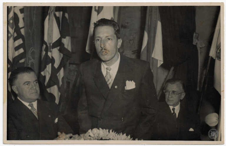 Registra uma sessão solene, identificada como o encerramento do Primeiro Congresso de História Catarinense, realizado em Florianópolis. No plano médio, um homem em traje formal (paletó claro e...