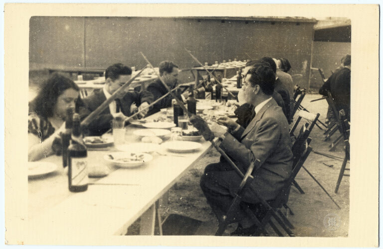 Grupo de congressistas durante o almoço do Primeiro Congresso de História Catarinense, realizado no pátio do Colégio Catarinense, em Florianópolis, no dia 10 de outubro de 1948. A...