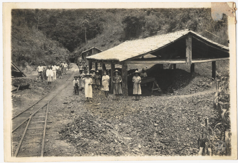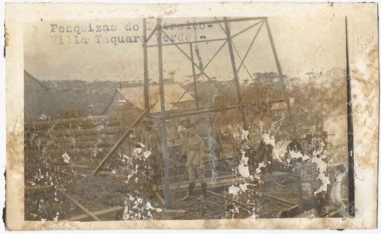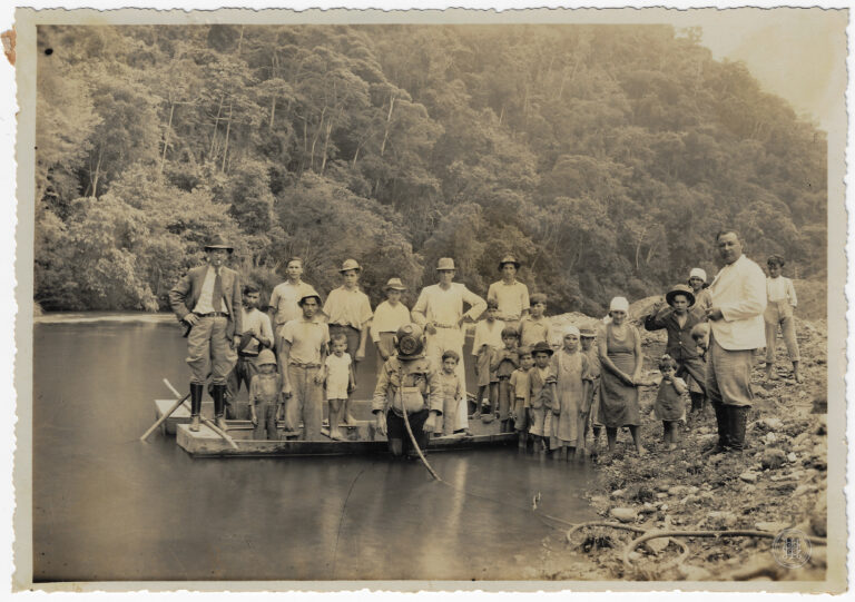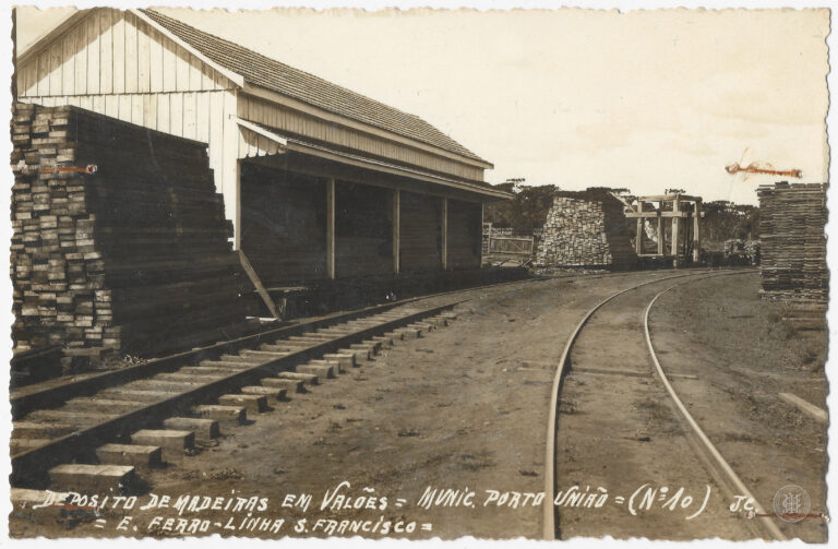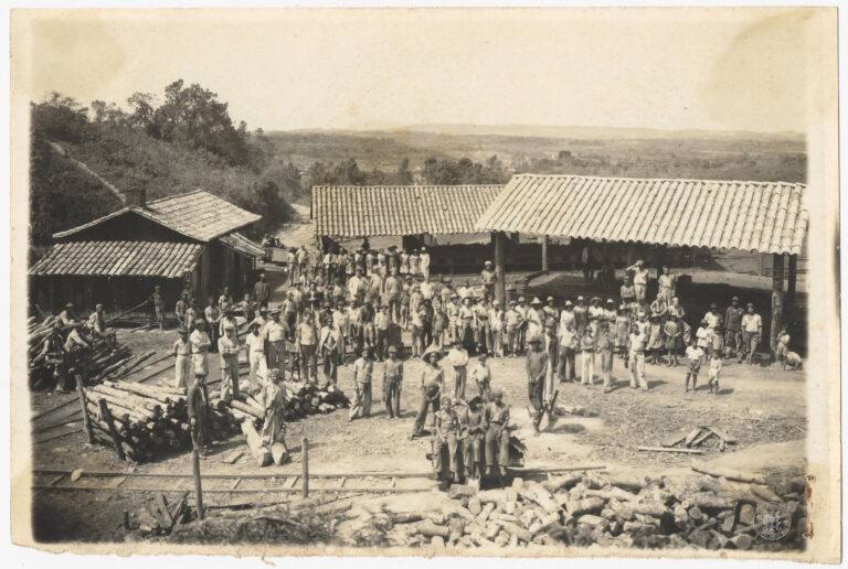 Complexo industrial madeireiro em Santa Catarina, situado à margem de um corpo d’água. No primeiro plano, observa-se uma faixa de terreno com vegetação rasteira e um pequeno tronco...