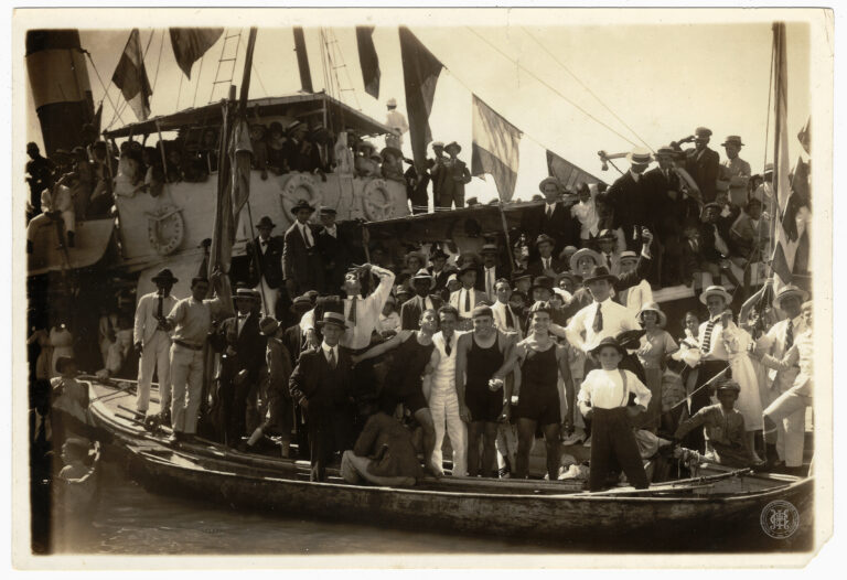 Um grupo numeroso de pessoas a bordo de embarcações durante uma regata em Florianópolis, Santa Catarina, no ano de 1900. A composição organiza-se em planos distintos: no primeiro...