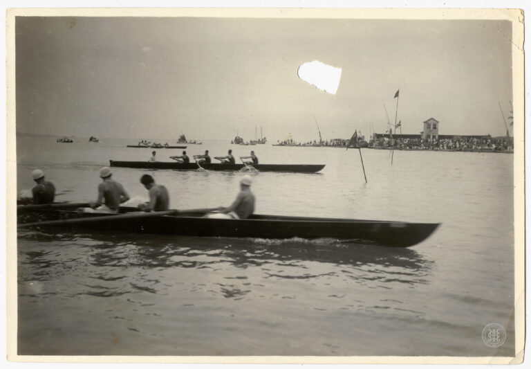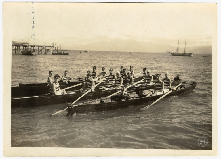 Grupo de remadores e sócios dos clubes Riachuelo e Martinelli reunidos na Baía Sul, em Florianópolis, no dia 21 de abril de 1921. A cena celebra o desfecho...
