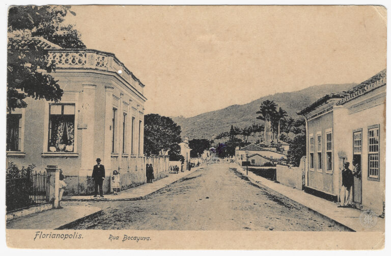 Datado de 1910, apresenta uma vista em perspectiva da Rua Bocaiuva com a intersecção da Avenida Trompowsky, em direção ao Morro da Cruz, em Florianópolis, Santa Catarina. A...
