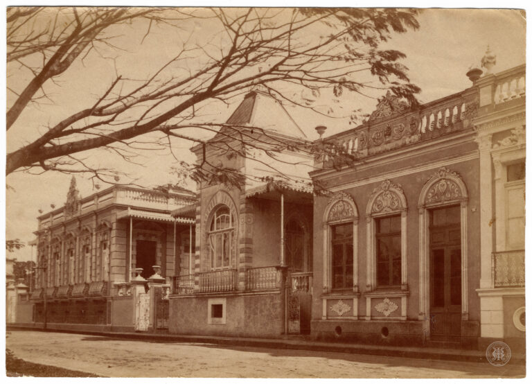 Conjunto arquitetônico residencial de alto padrão localizado na Praça Pereira Oliveira, em Florianópolis, Santa Catarina, por volta do ano 1900. A composição é estruturada a partir de uma...