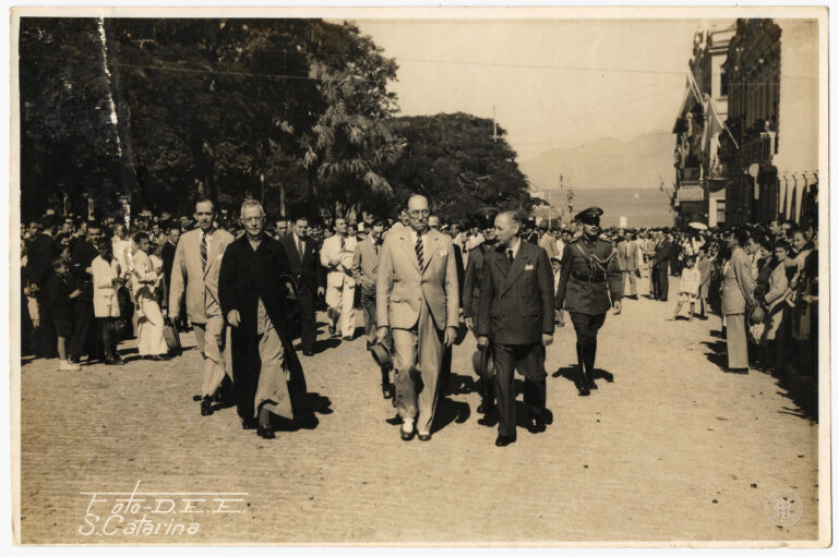 Discurso do Interventor Nereu Ramos durante a “Parada da Vitória”, realizada no Jardim Oliveira Belo, na Praça XV de Novembro, em Florianópolis. O evento, ocorrido em 8 de...