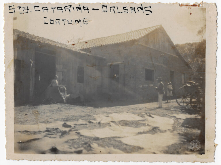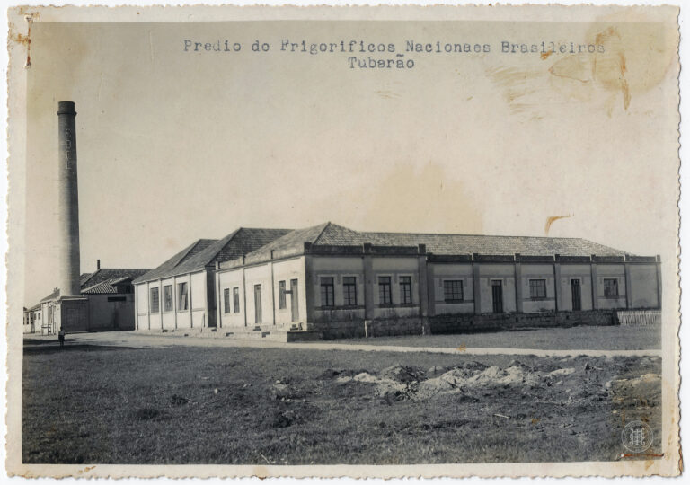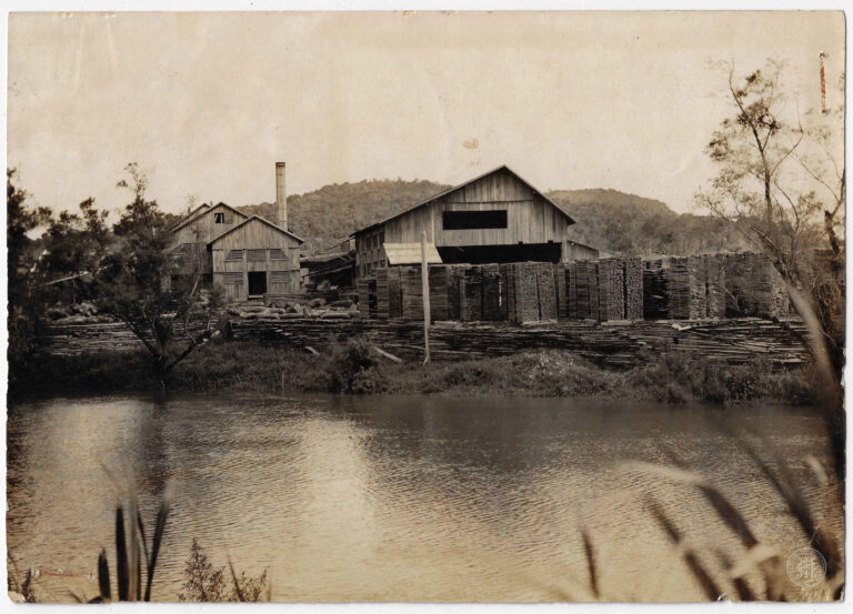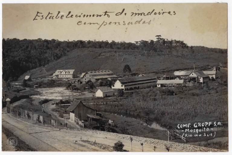 Vista da Fecularia da Companhia Lorenz e da represa do Rio Benedito, integrando a paisagem industrial a elementos naturais em Timbó, Santa Catarina. Em primeiro plano, destaca-se uma...