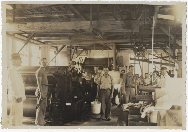 by Eugenio Pelegrin Leia Mais...Vista interna da fábrica de fitas de seda de Otto Schaefer em Brusque, Santa Catarina. A composição organiza-se com um grande conjunto de maquinário têxtil industrial ocupando todo...