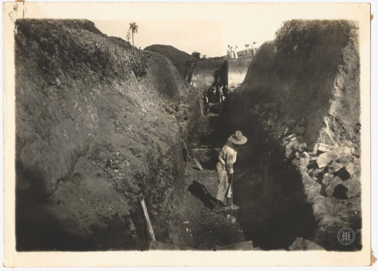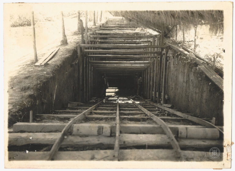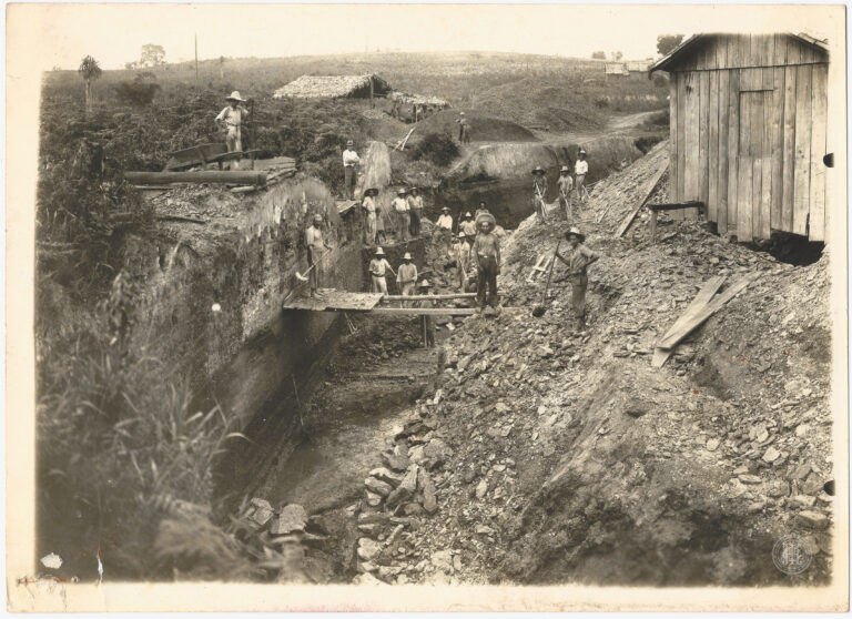 Extração mineral a céu aberto em Criciúma, Santa Catarina. A imagem é estruturada por um plano de corte profundo no terreno, formando um corredor ladeado por altas encostas...