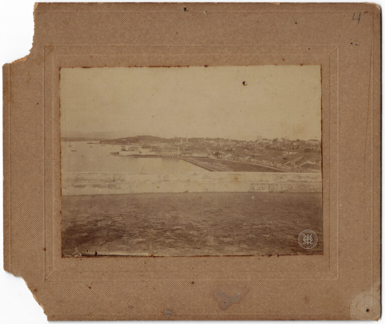 Esta fotografia, montada sobre um suporte de cartão texturizado de cor parda, apresenta uma vista panorâmica de Florianópolis, Santa Catarina, a partir de um plano elevado. No primeiro...