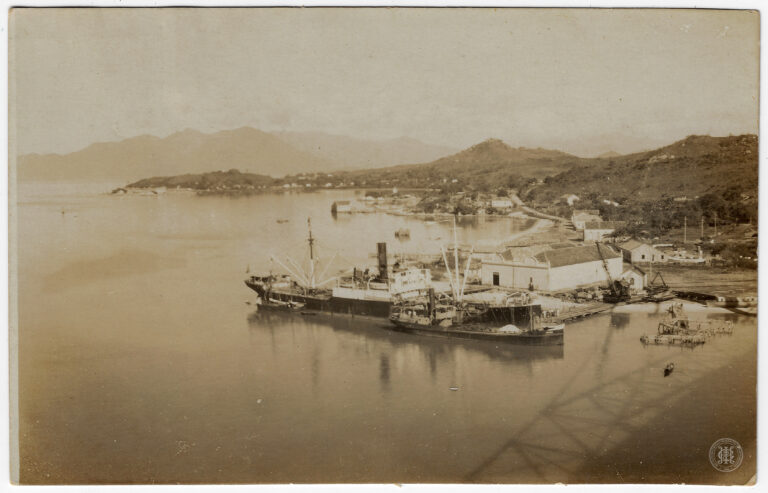 Canhoneira “Tupy” atracada em um trapiche de madeira em Santa Catharina, em janeiro de 1906, durante o retorno de marinheiros navais de exéquias. A composição organiza-se com uma...