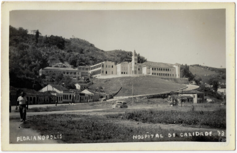 Vista panorâmica do Hospital de Caridade, localizado na Rua Menino Deus, em Florianópolis, Santa Catarina, na década de 1960. A composição organiza-se com uma área de solo exposto...