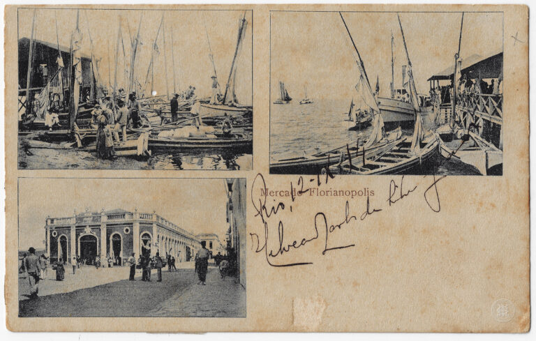 Uma composição tripartida com vistas do Mercado Público Municipal de Florianópolis, em Santa Catarina, no ano de 1898. No quadrante superior esquerdo, observa-se o cais com diversas embarcações...