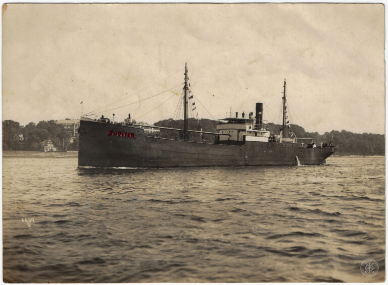 Vapor JUPITER navegando em águas calmas. A embarcação, de grande porte e casco escuro, domina o plano médio e está posicionada de perfil, com a proa voltada para...