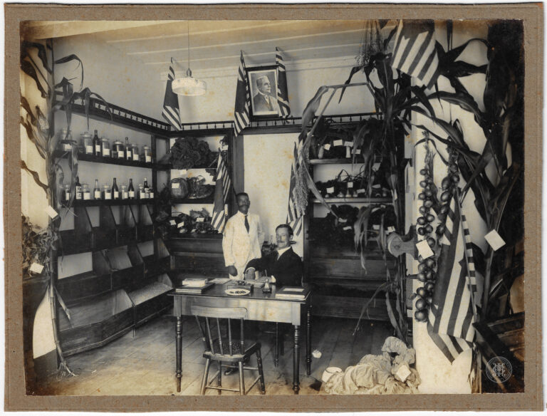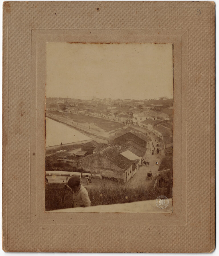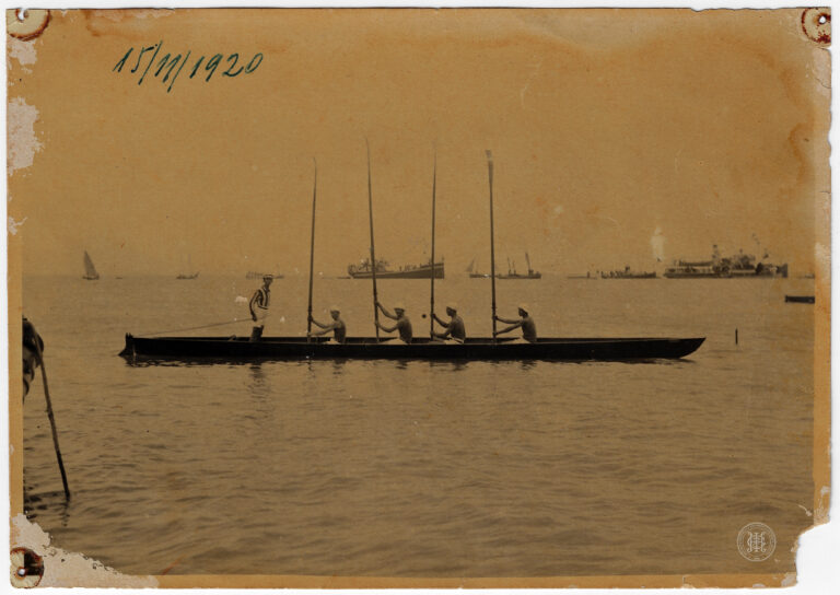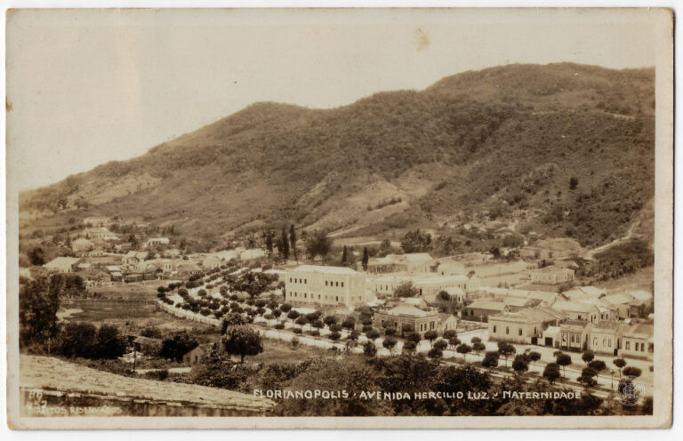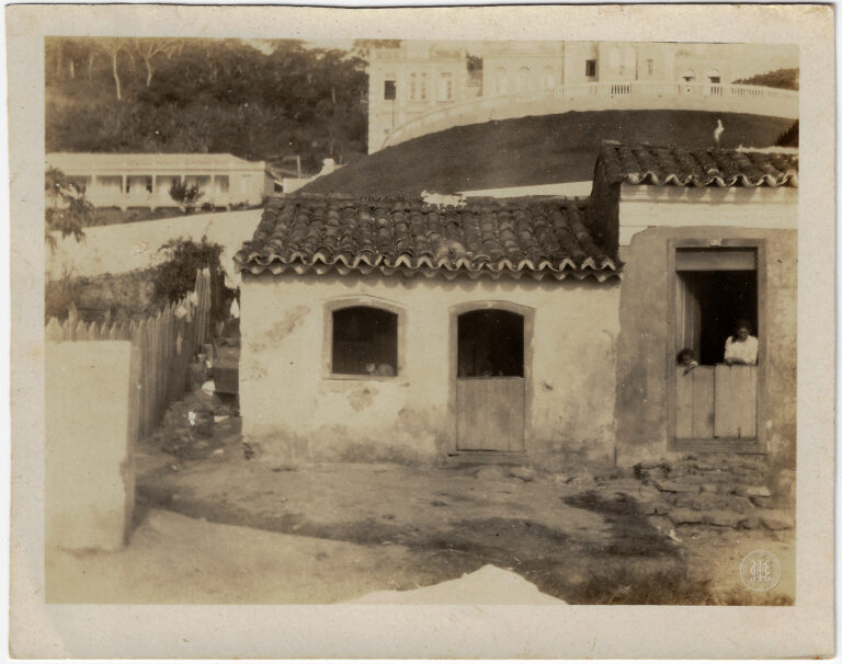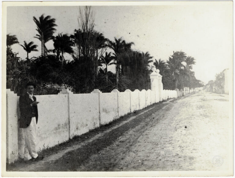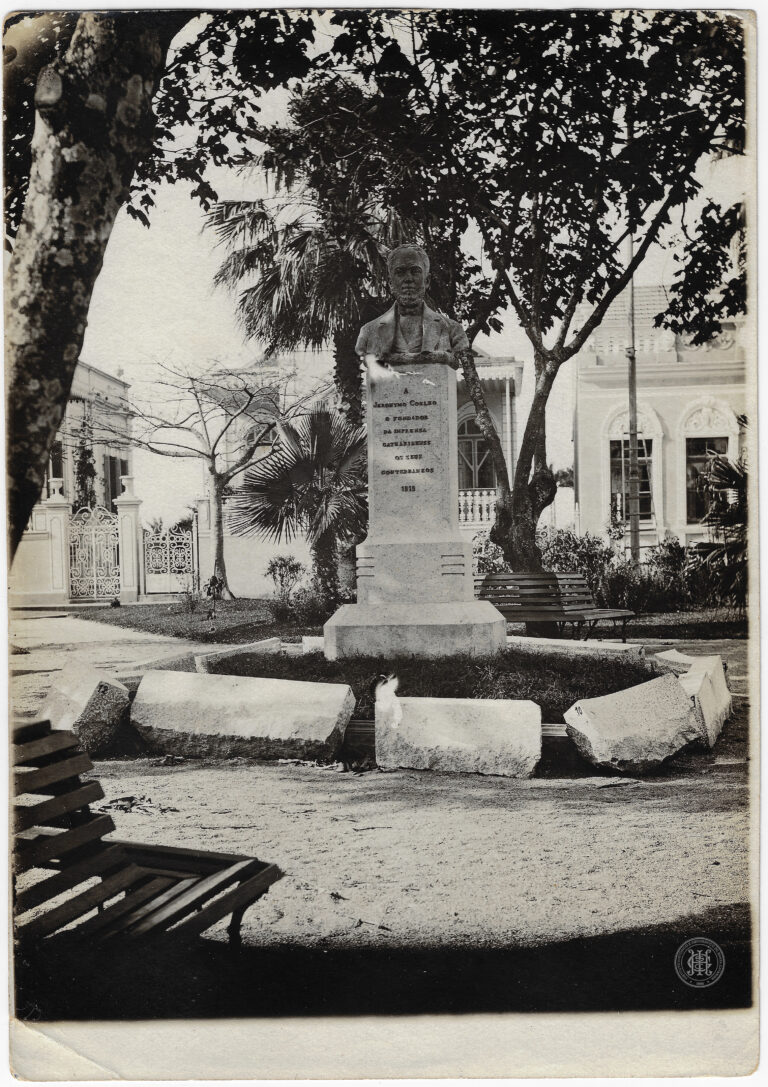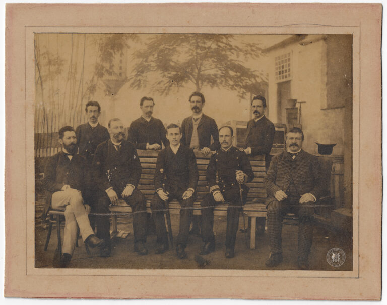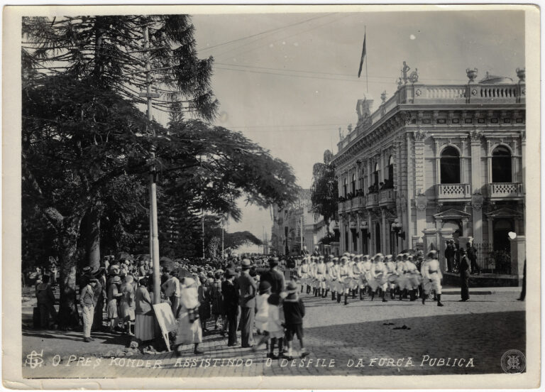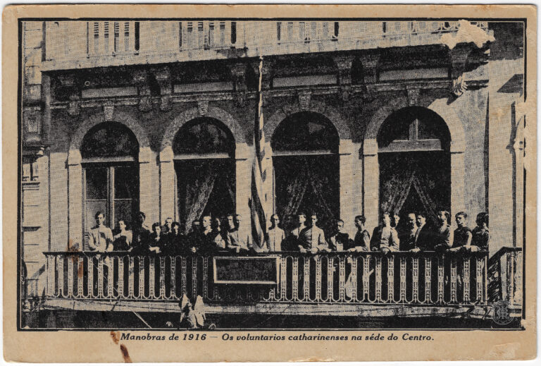 Grupo de homens identificados como voluntários catarinenses na sede do Centro, em Florianópolis, durante as Manobras de 1916. A composição organiza-se em torno de uma sacada de balustrada...