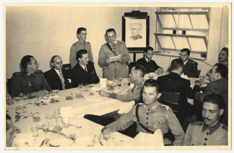 Almoço oferecido pela Força Policial Estadual ao Contingente Expedicionário no Quartel General da Força Policial, à Praça Getúlio Vargas, em Florianópolis. A cena é composta em torno de...