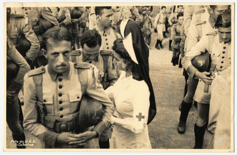 Concentração de militares do 14º Batalhão de Caçadores e da população civil durante a missa campal realizada em 8 de maio de 1944. A imagem, capturada a partir...