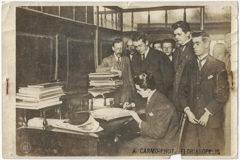 Vista panorâmica a partir do Morro da Cruz, registrando a malha urbana central de Florianópolis, Santa Catarina. A composição organiza-se com a encosta do morro em primeiro plano,...