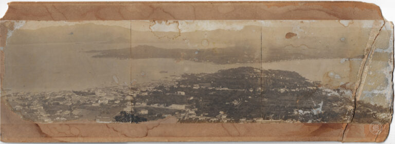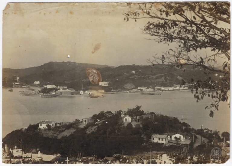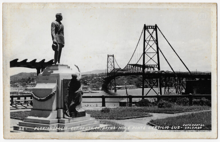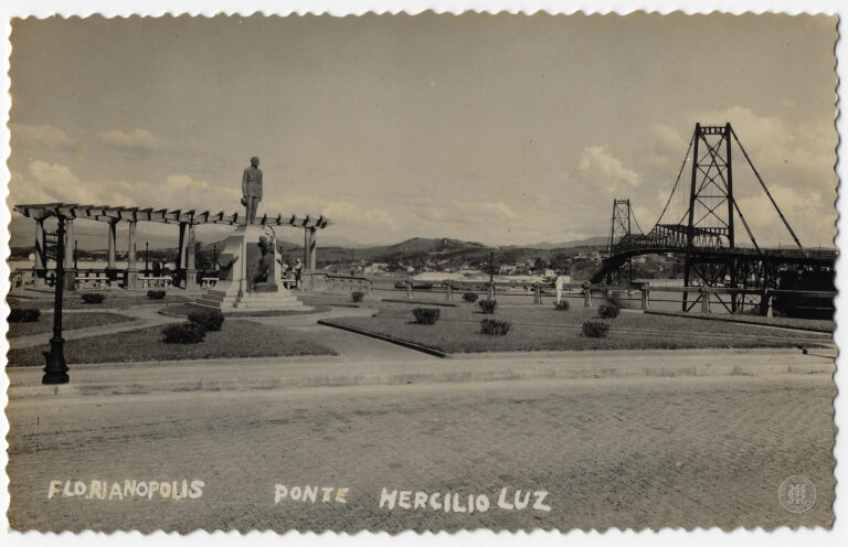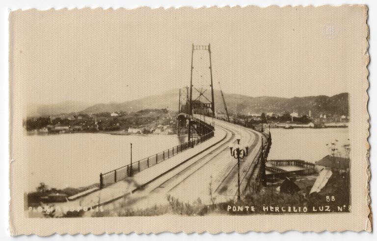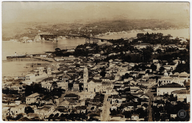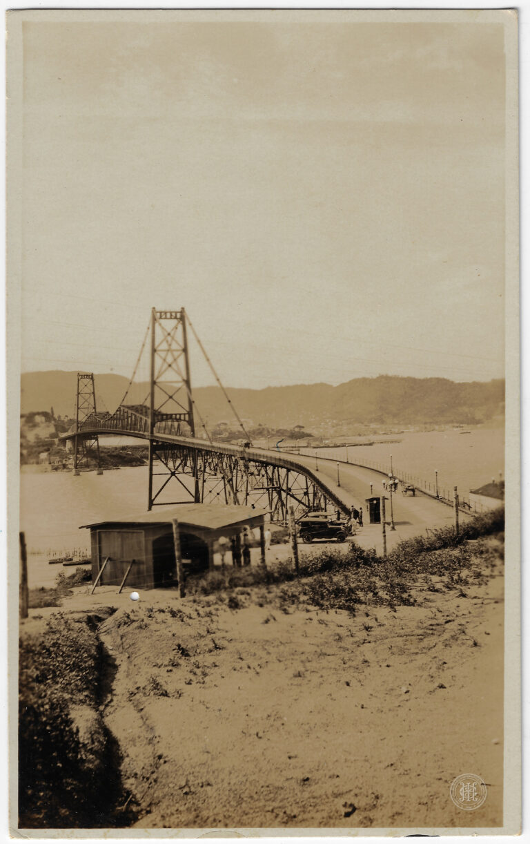 Esta fotografia horizontal em tons de sépia apresenta uma vista aérea e panorâmica da Ponte Hercílio Luz, em Florianópolis, Santa Catarina, capturada a partir de um ponto elevado....