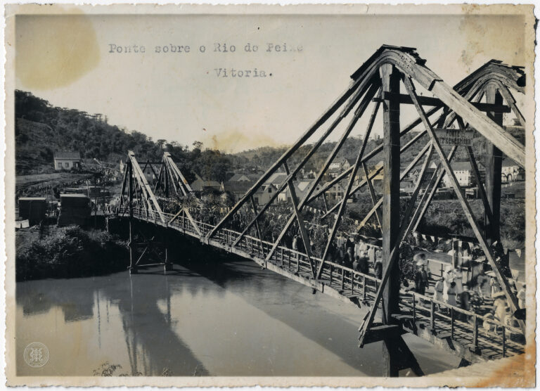 by Cleiton Bitencourt Leia Mais...Vista de uma ponte em Timbó, 1938, inserida em uma paisagem natural composta por um curso d’água e vegetação densa. A imagem organiza-se com o leito do rio...