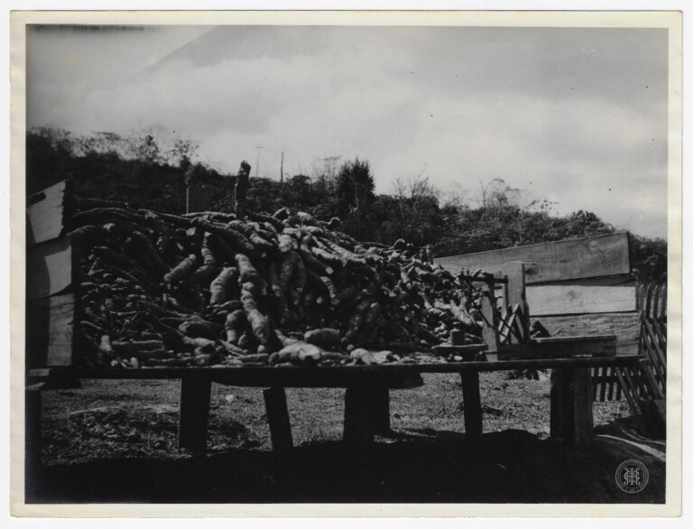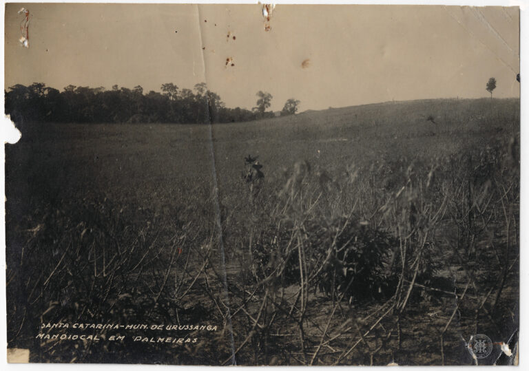 by Leticia Emanuelle Rigo Leia Mais...Atividade de beneficiamento agrícola em Santa Catarina. No plano médio, centralizado, destaca-se um grande volume de raízes de mandioca empilhadas sobre uma plataforma elevada de madeira, apoiada por...