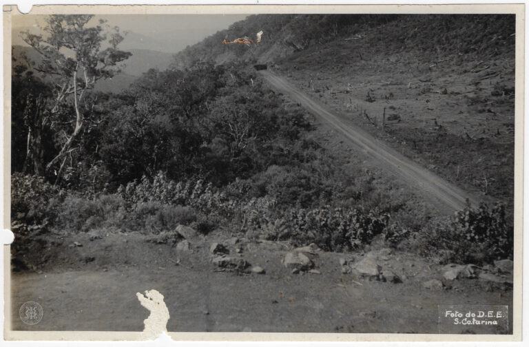 by Leticia Emanuelle Rigo Leia Mais...Esta fotografia em tons de cinza, com orientação horizontal e margens brancas serrilhadas, registra uma perspectiva aérea oblíqua de uma estrada de rodagem em meio a um relevo...