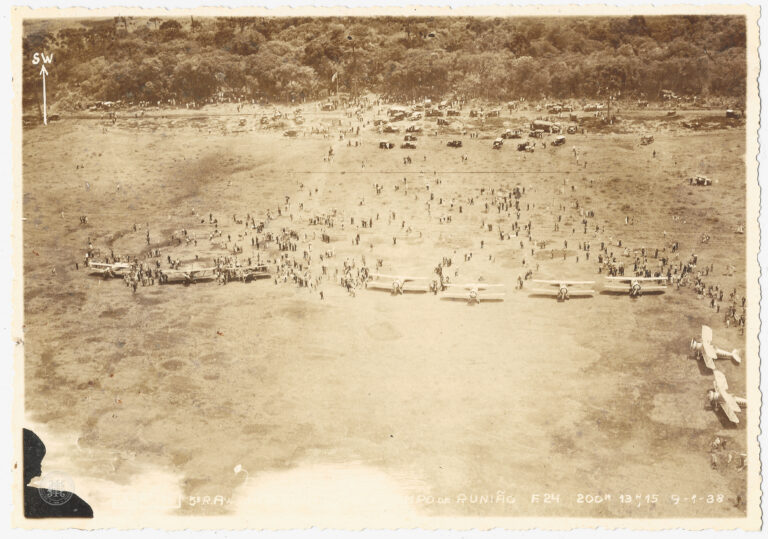 Base Aérea de Florianópolis, no bairro Ressacada, em 1930, local utilizado para a demonstração de aviões navais. A composição organiza-se com uma área de vegetação rasteira e arbustiva...