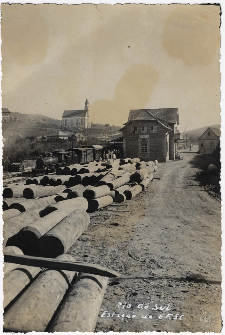 by Leticia Emanuelle Rigo Leia Mais...Vista da Estação Ferroviária de Rio do Sul, vinculada à Estrada de Ferro Santa Catarina (E.F.S.C.). No primeiro plano, o solo de terra batida é ocupado por um...
