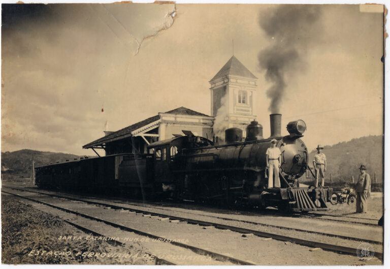 by Eugenio Pelegrin Leia Mais...Estação Ferroviária de Rio do Sul, em Santa Catarina. A imagem, captada em ângulo oblíquo a partir da esquerda, apresenta em primeiro plano os trilhos da Estrada de...