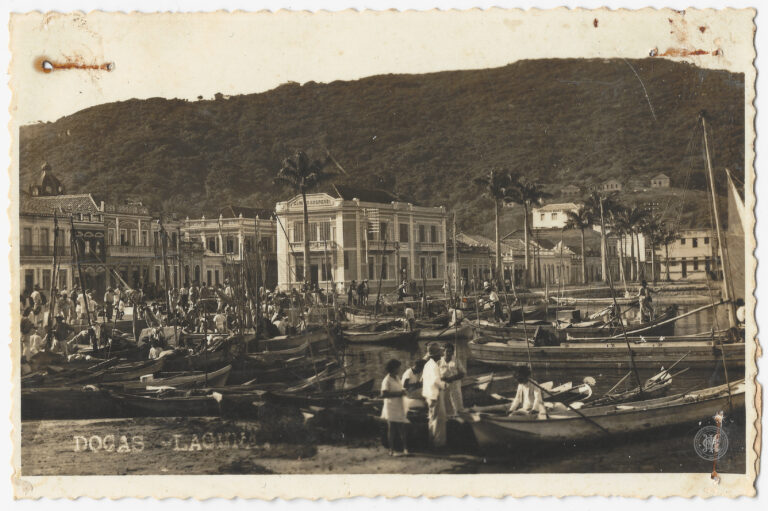 Apresenta uma vista central do cais portuário e do núcleo urbano de Laguna, Santa Catarina. A composição organiza-se a partir de um plano inferior ocupado por uma margem...