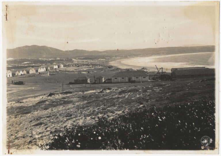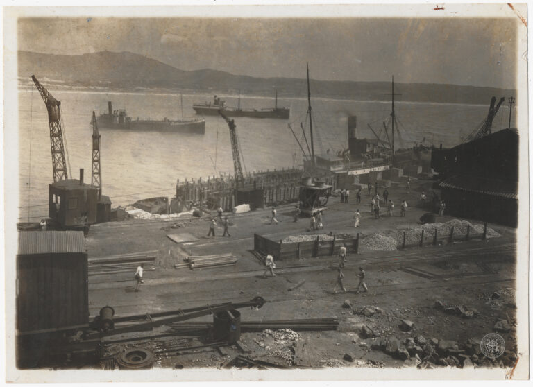 Vista da área portuária e ferroviária da cidade de Laguna, Santa Catarina. A composição é estruturada em múltiplos planos, iniciando em primeiro plano por uma mureta de proteção...