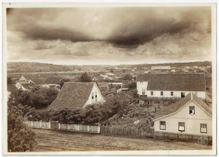 Esta fotografia registra uma vista elevada da cidade de Três Barras, destacando em primeiro plano a organização de uma vila operária e, ao fundo, o complexo industrial da...