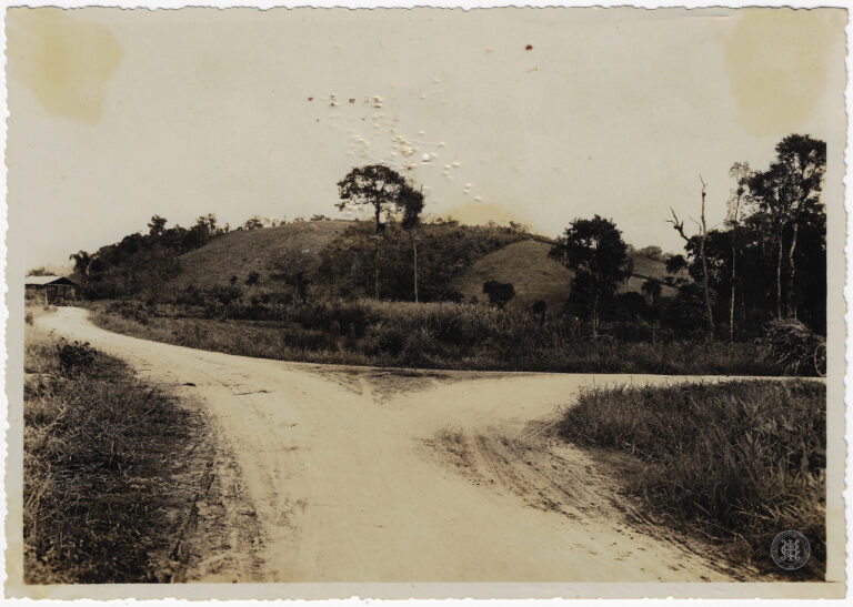 Trecho de uma estrada na localidade de Ribeirão do Ouro (atual Botuverá), antigo distrito de Brusque, Santa Catarina. A imagem organiza-se com o leito da estrada em primeiro...