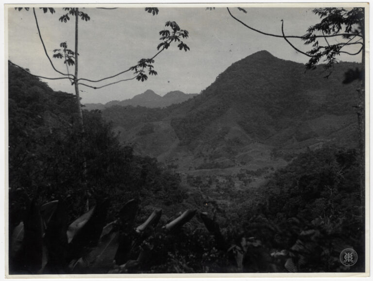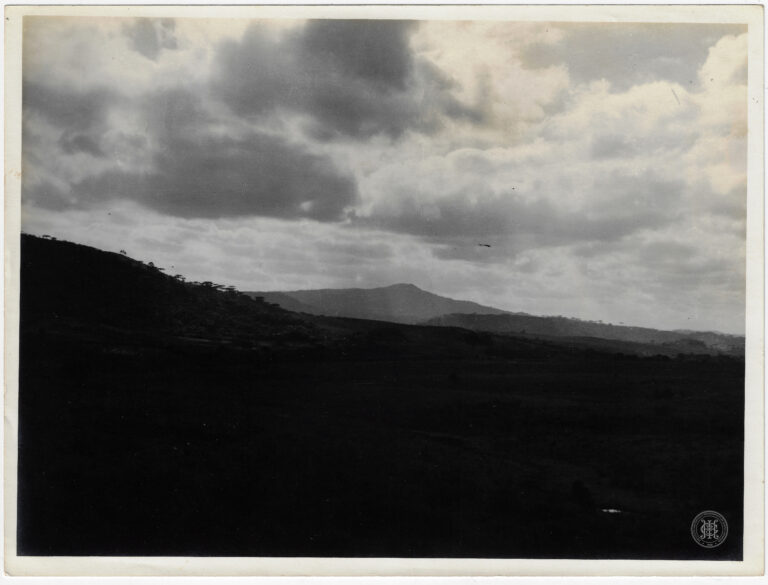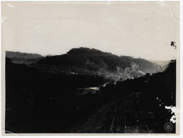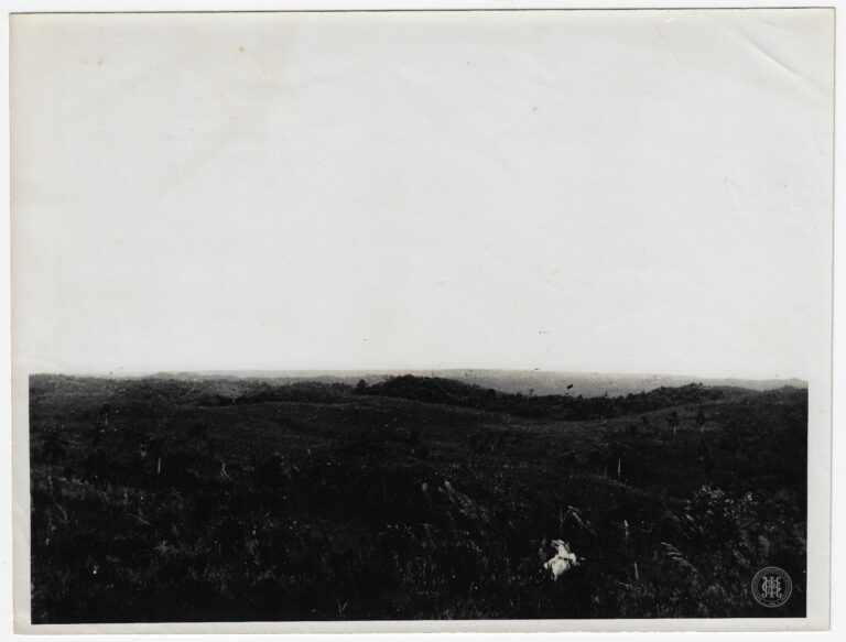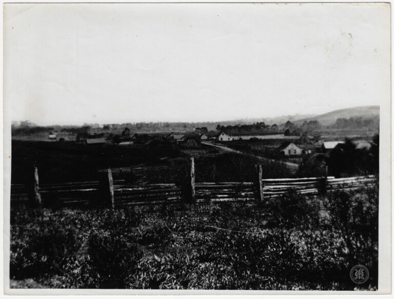by Eugenio Pelegrin Leia Mais...Vista panorâmica de um núcleo rural ou colônia em Santa Catarina. No primeiro plano, observa-se uma área de vegetação rasteira e densa que precede uma cerca de madeira...