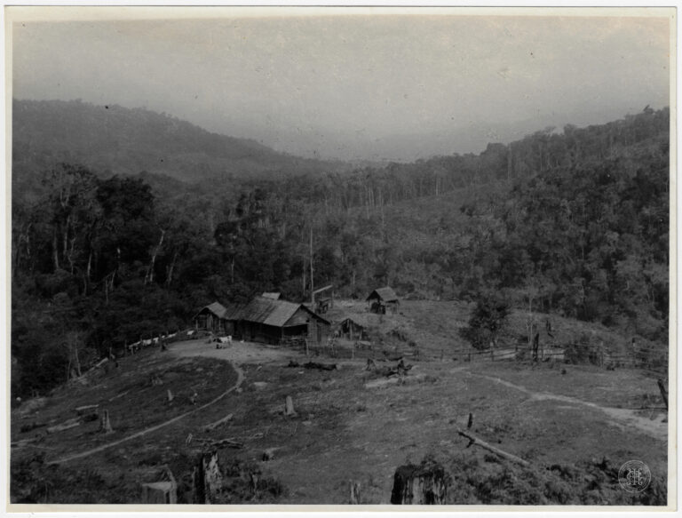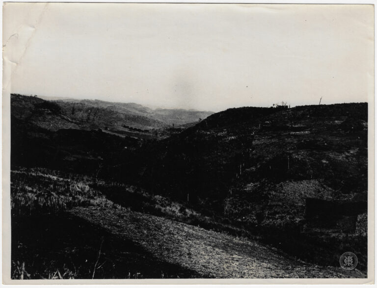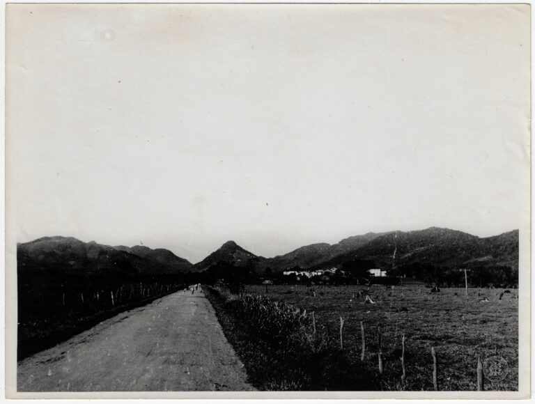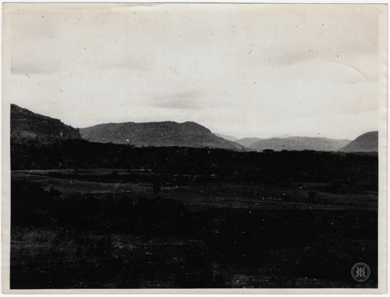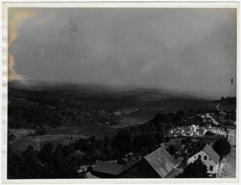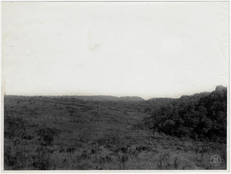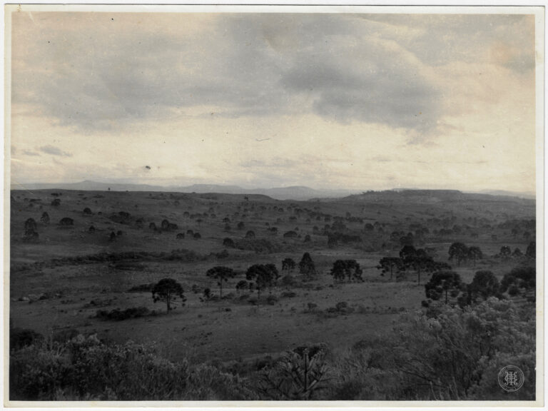 Vista panorâmica de uma região de planalto em Santa Catarina, caracterizada por uma vasta área de campo com vegetação esparsa. A composição organiza-se em planos profundos, iniciando com...