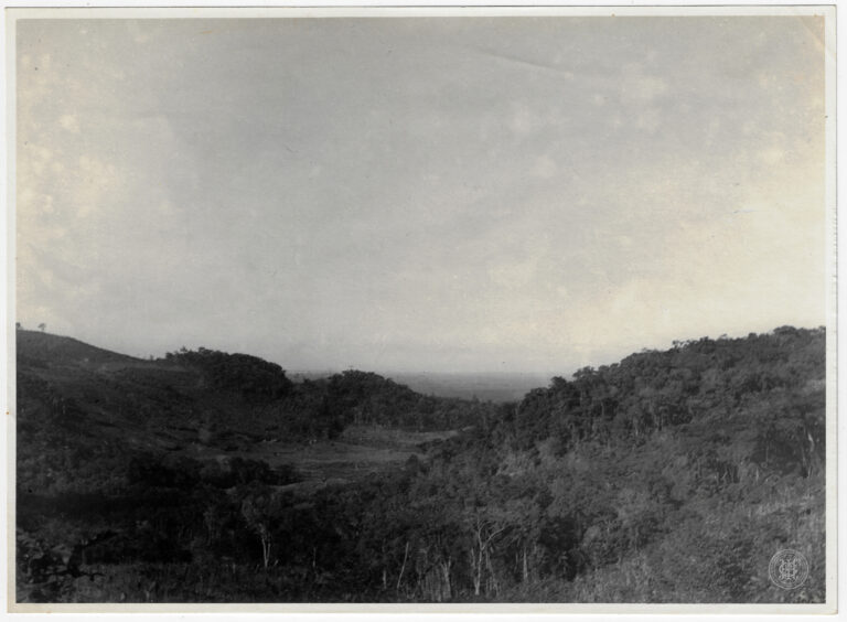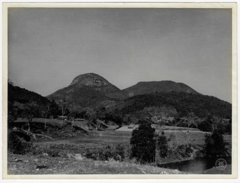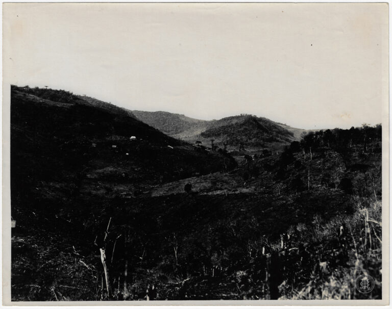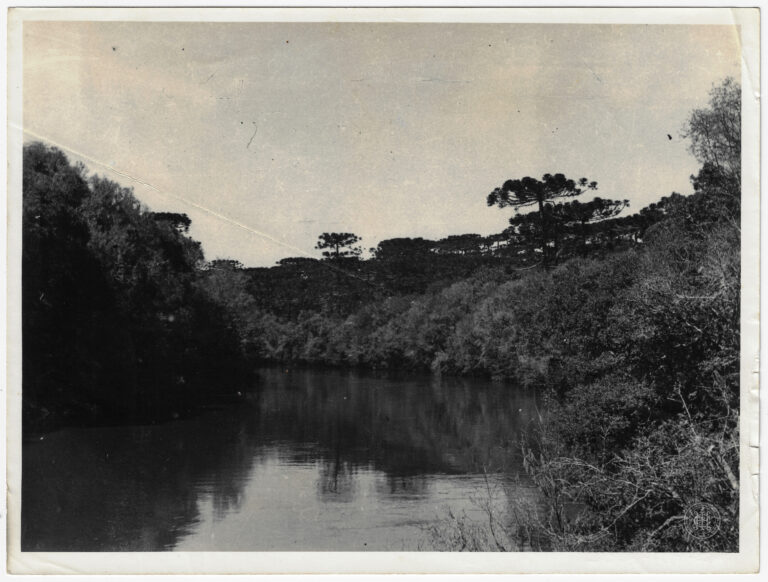 Curso d’água em Santa Catarina, ladeado por vegetação densa. No primeiro plano e plano médio, as margens do rio são cobertas por matas ciliares ricas em folhagens arbustivas...