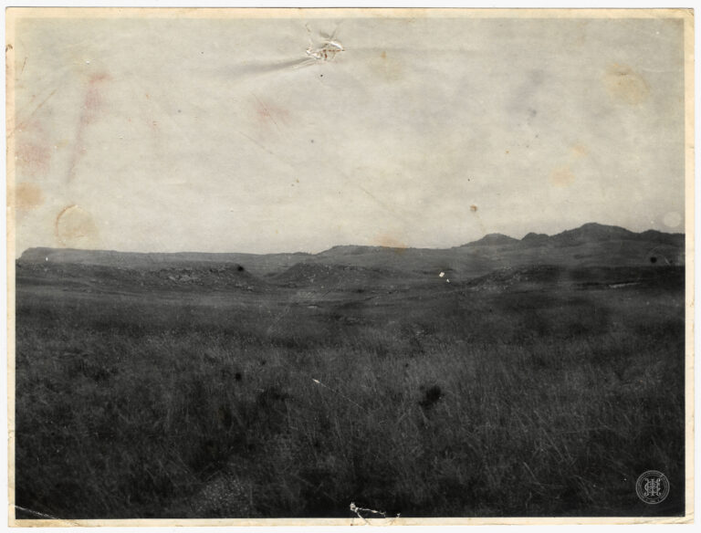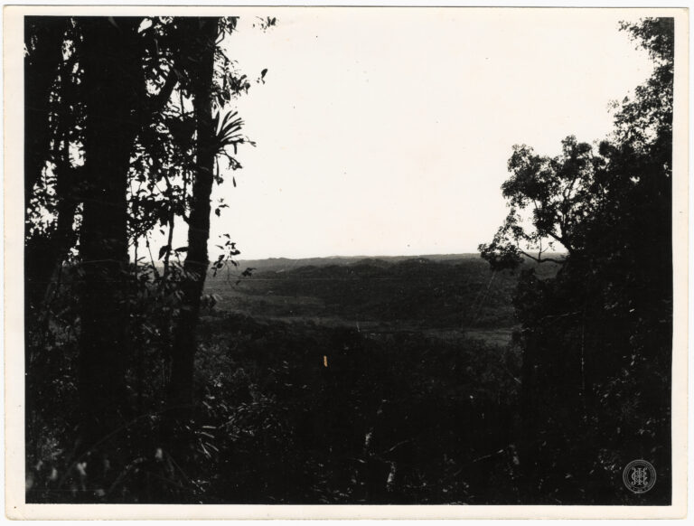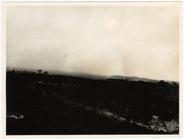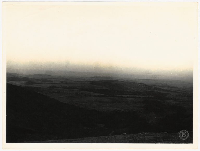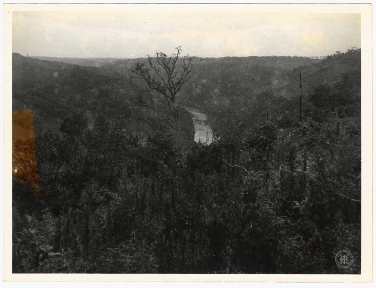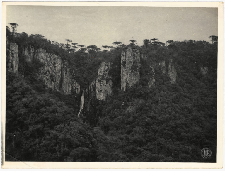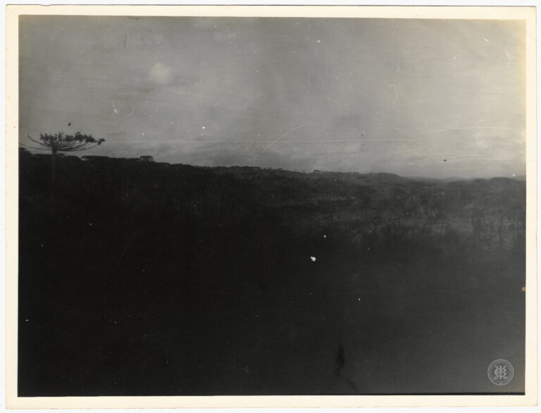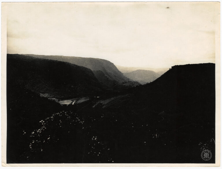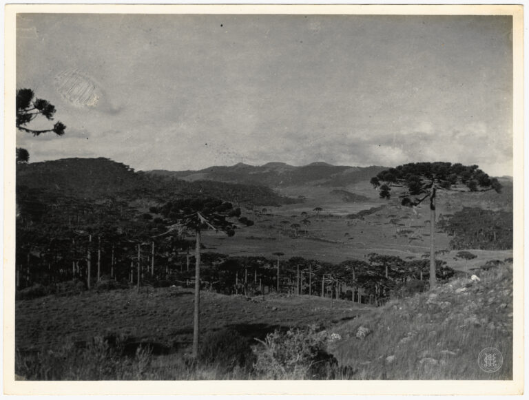Vista panorâmica de uma região de vale e serras em Santa Catarina. A composição organiza-se a partir de um primeiro plano em declive acentuado, ocupado por vegetação rasteira...