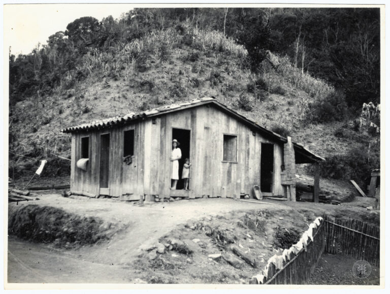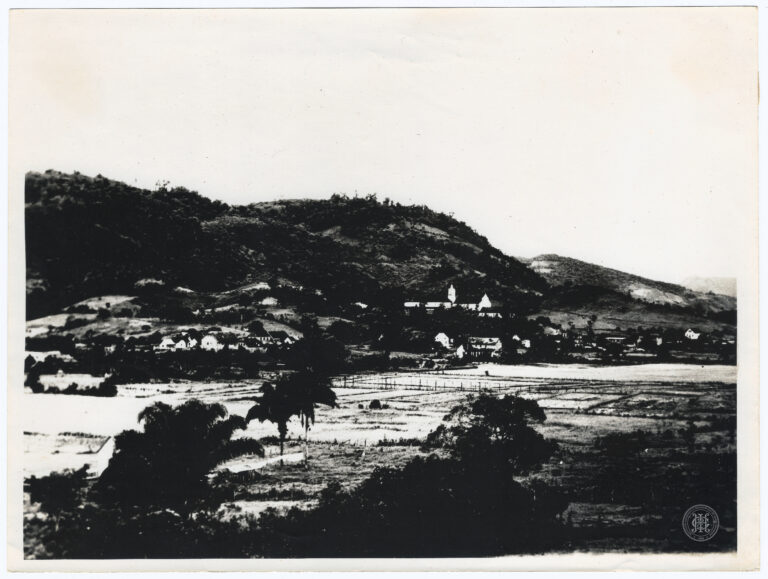 Vista aérea oblíqua da Vila de Vitória (atualmente Videira), situada no 4º distrito de Caçador, Santa Catarina. A composição organiza-se a partir de um ponto de vista elevado,...