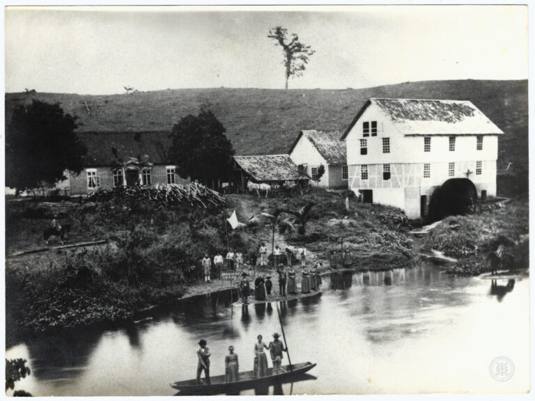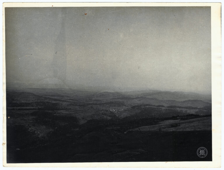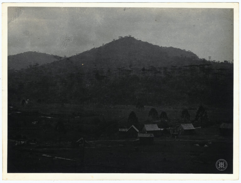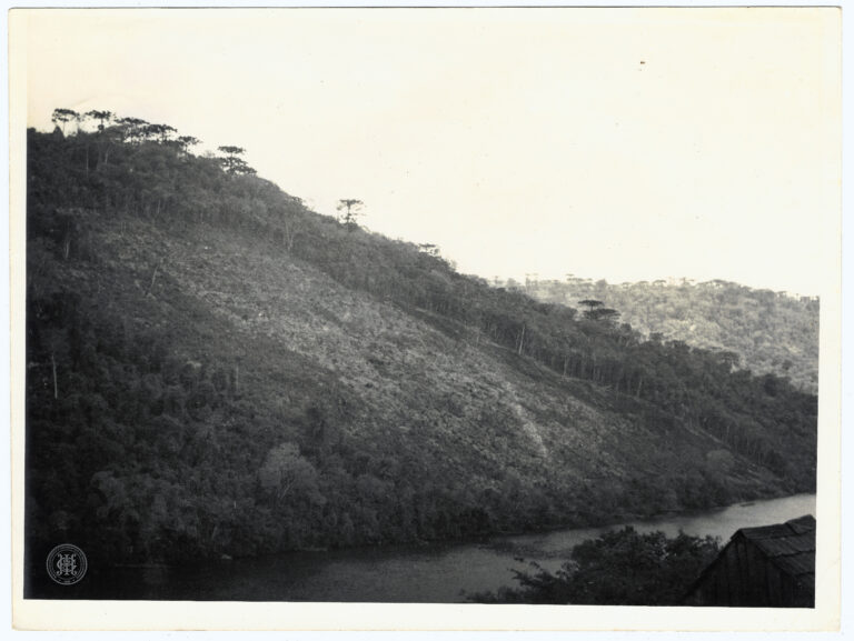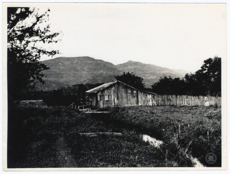 Fotografia apresentando uma cena de ocupação rural em Santa Catarina. A composição é estruturada a partir de um cercado de madeira rústica que atravessa o primeiro plano, delimitando...