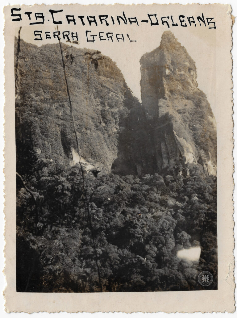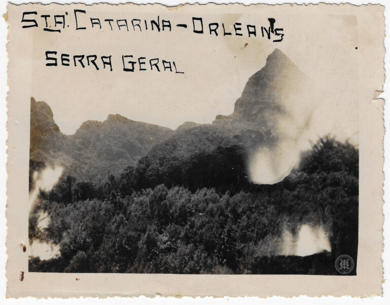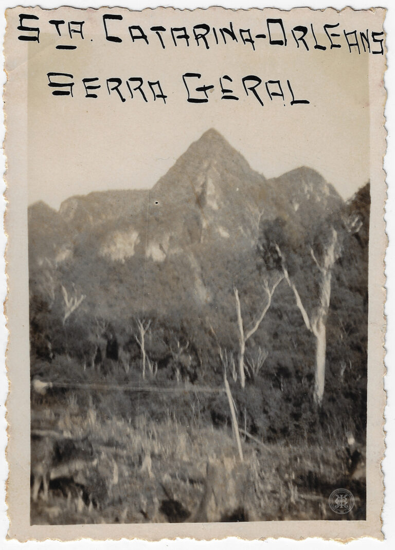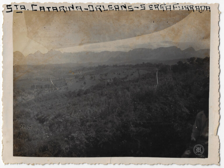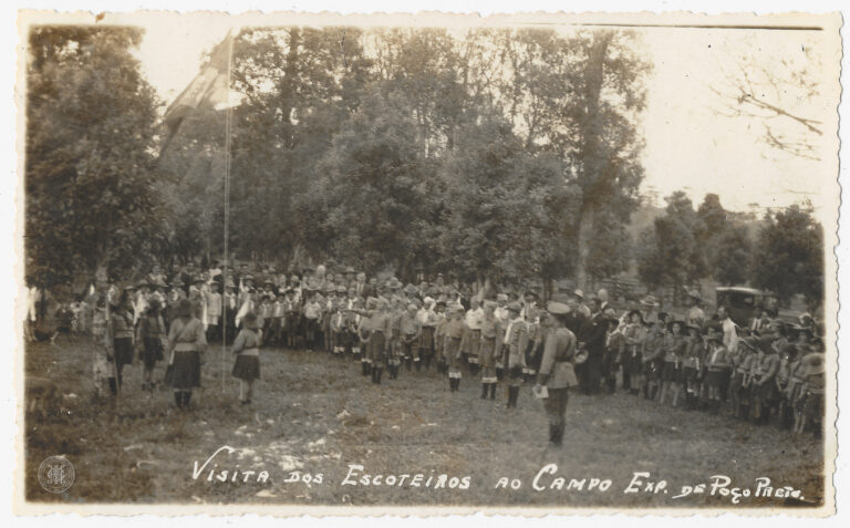 Agrupamento de escoteiros em formação durante uma visita ao Campo Experimental de Poço Preto, no atual município de Irineópolis (antigo distrito de Porto União), Santa Catarina. A composição...