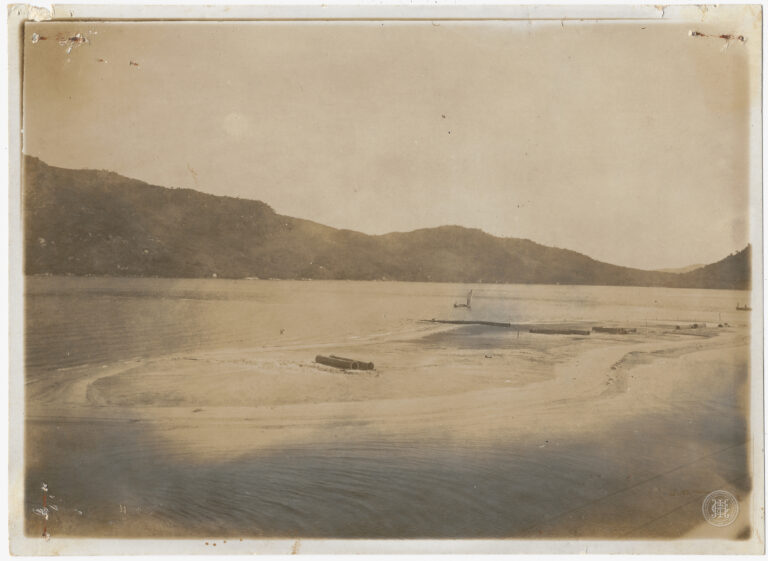 Fotografia apresentando uma vista do mar e da infraestrutura de saneamento ou logística em Imbituba, Santa Catarina, no ano de 1938. No primeiro plano, observa-se uma área de...