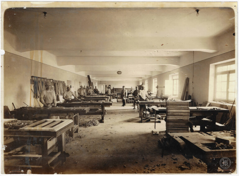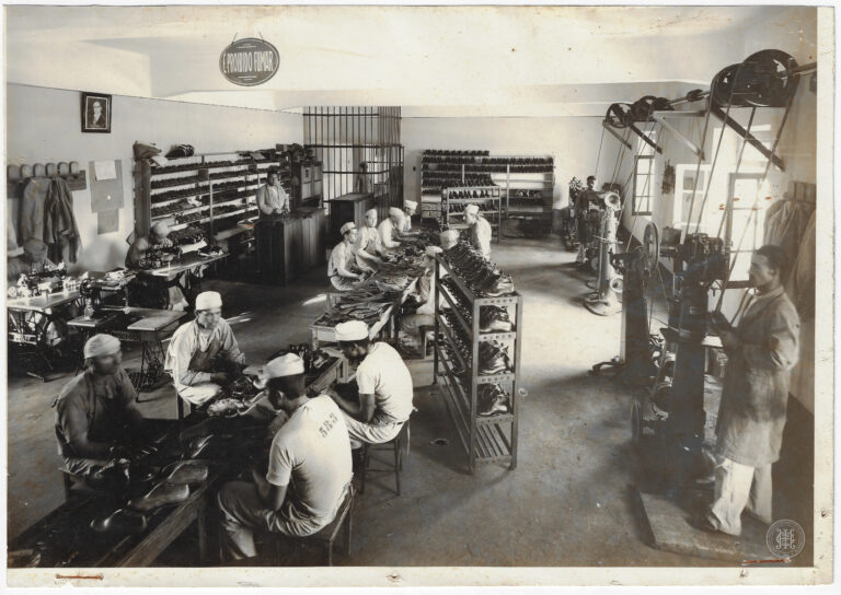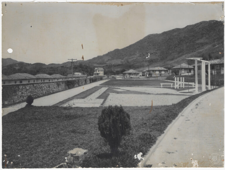 Esta fotografia registra a área externa da Penitenciária de Florianópolis, em Santa Catarina. A imagem é composta sob um ângulo levemente elevado, apresentando em primeiro plano um gramado...