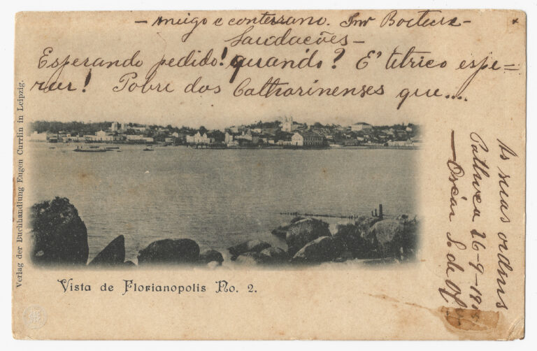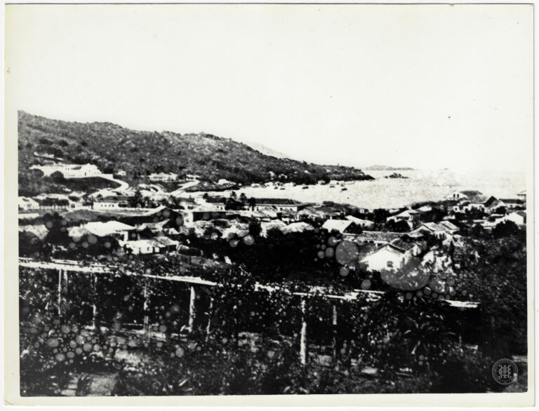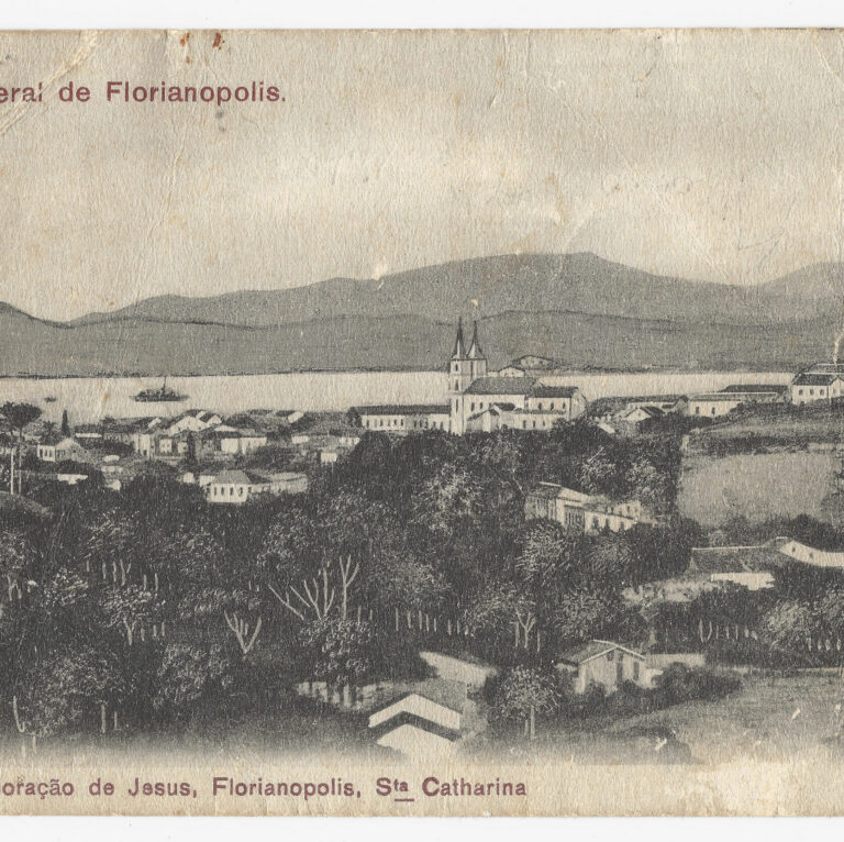 Esta fotografia registra uma vista panorâmica da “parte sul” de Florianópolis, antiga Nossa Senhora do Desterro, capturada a partir de um ponto elevado identificado como a ladeira do...