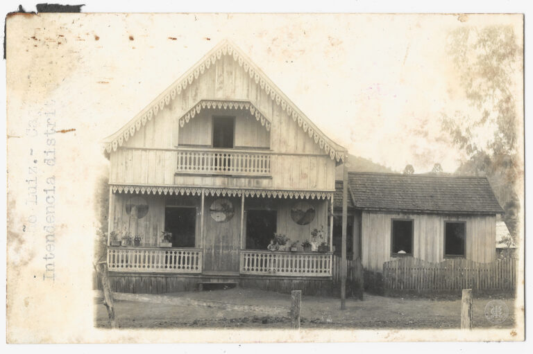 Fachada frontal de uma edificação de madeira identificada como a Intendência Distrital, localizada em São Luiz, no município de Caçador, Santa Catarina. O edifício principal, de dois pavimentos,...