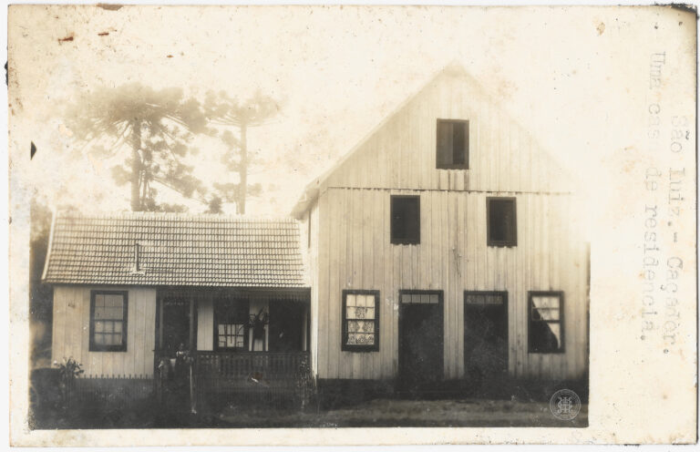 Fachada lateral e frontal de uma residência de madeira situada no antigo distrito de São Luiz (atual Iomerê), no município de Caçador, Santa Catarina. A edificação é composta...